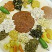 A combination of powdered chickpea stew, lentil stew, cooked carrots, cabbage, potato and salad. Each flavored with a mixture of Ethiopian spices.